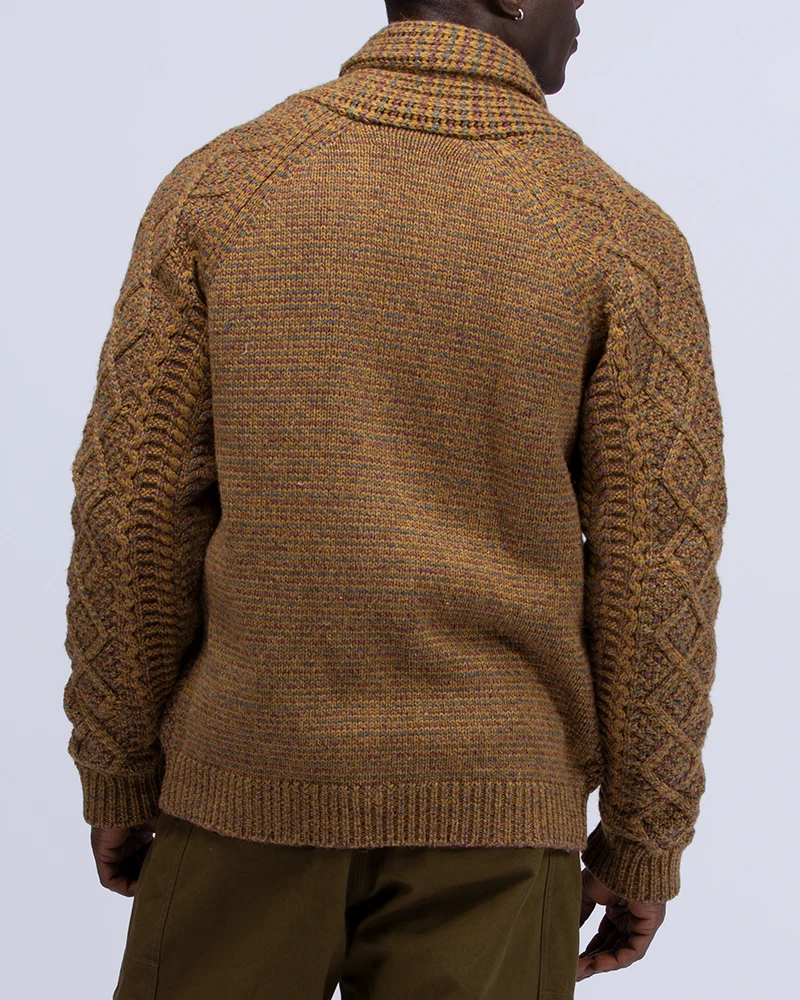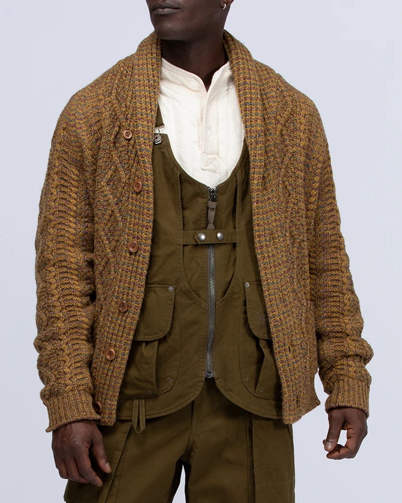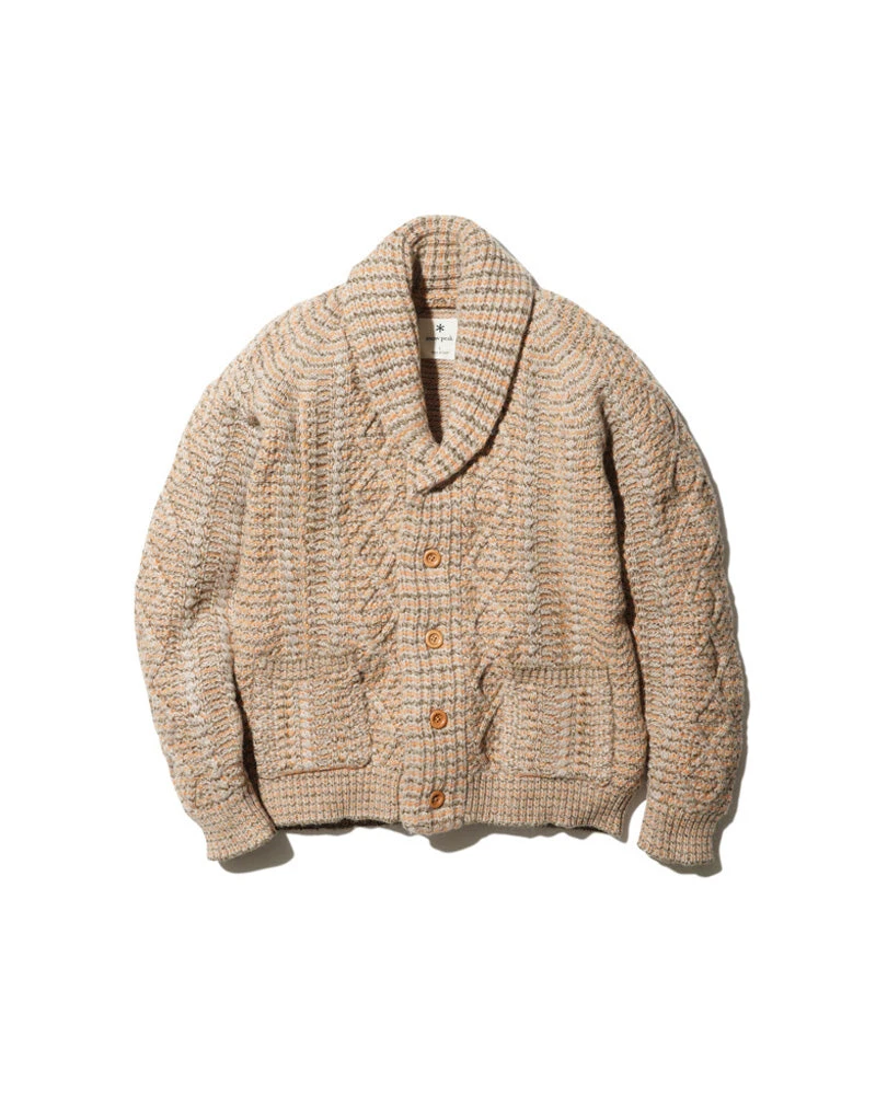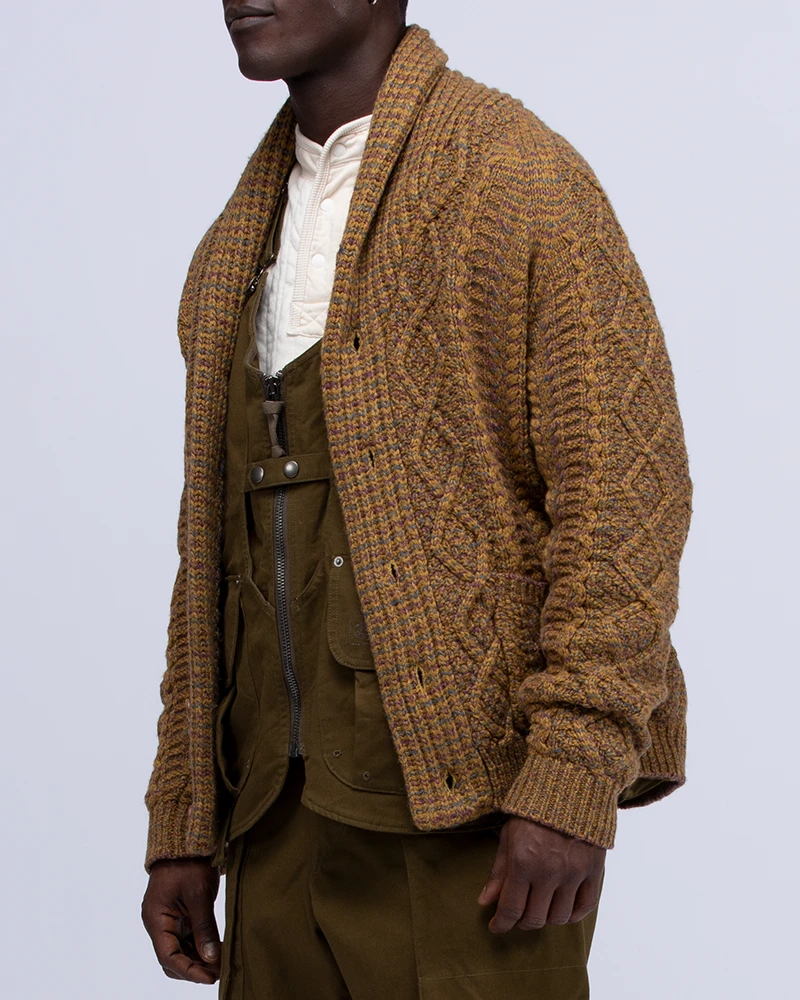Alpaca Knit Cardigan is a shawl-collared chunky knit sweater. It is made of a blend of nylon, wool, and alpaca for a warm, voluminous feel. The Alpaca Knit Cardigan features a shawl collar, button closure, and dual front pockets.