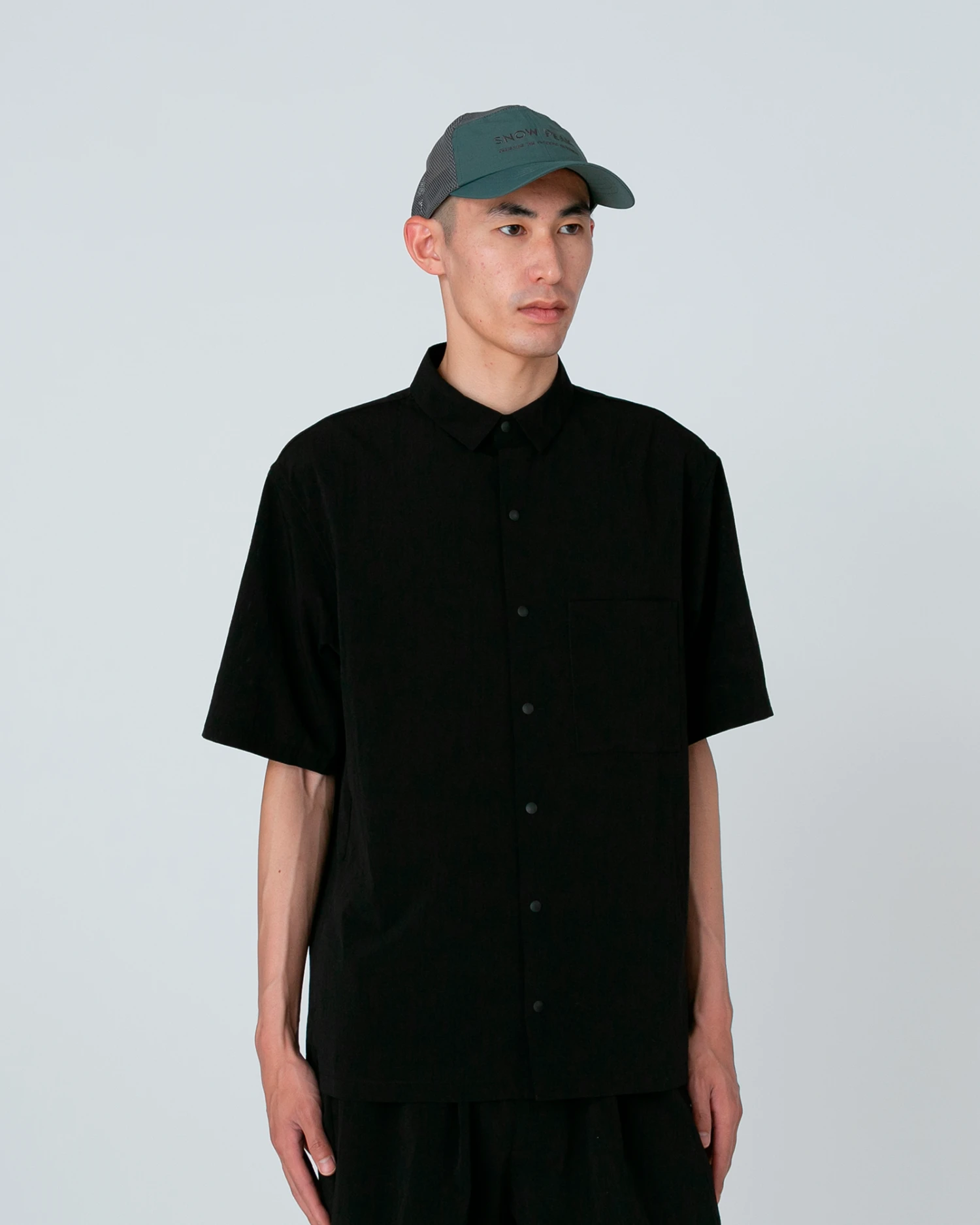 This short-sleeve shirt features a front opening with snap buttons for effortless dressing and temperature control. A distinctive chest pocket adds practicality, while easy-access side pockets offer additional storage. The hem is designed with a front-to-back length difference for a modern silhouette with a reflective logo. The relaxed fit and side slits provide ease of movement, making it an essential piece for early summer. We recommend taking your normal size for a standard fit.