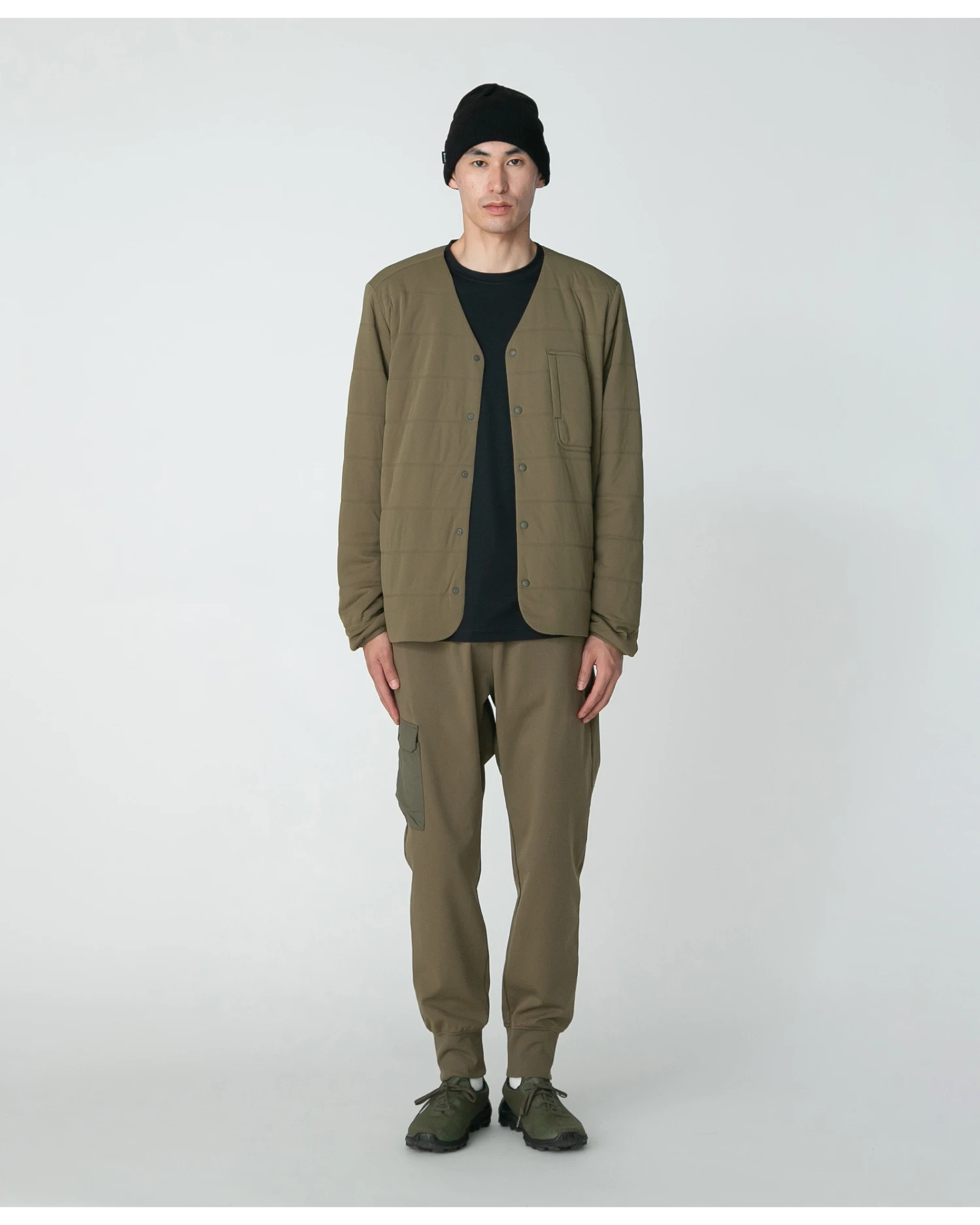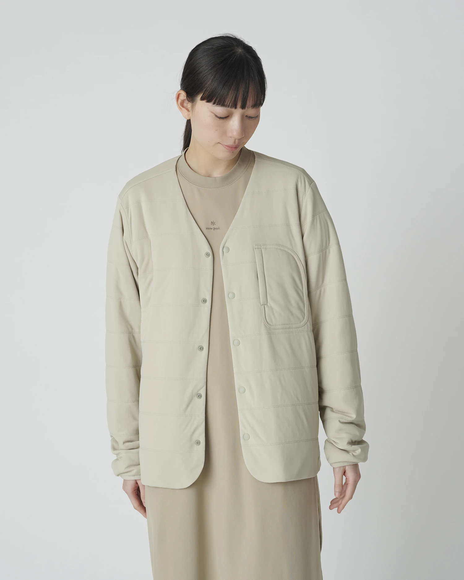 The front placket features logo-engraved dot buttons for easy fastening, while the chest pocket is secured with a snap button. Side pockets are designed with a seamless finish, allowing for a comfortable and natural hand rest. The cardigan is tailored for a close fit, with the hem falling just below the waist. For a more relaxed silhouette, we recommend sizing up. For a light layered look, pair it with the Recycled Cotton Heavy T-shirt, perfect for a light breeze.