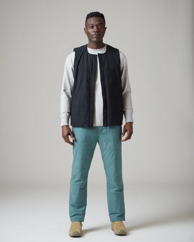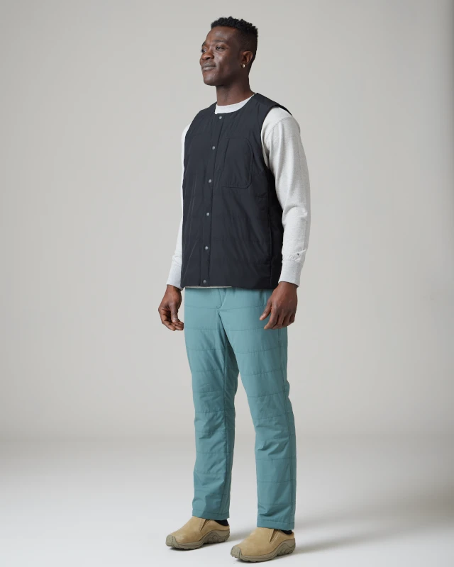 The Flexible Insulated Vest is a lightweight layering pullover quilted vest. The vest is made of recycled polyester and Primeflex material with a durable stretch and a water-repellent finish. The Flexible Insulated Vest features a crew neck with snap button closure, a left chest pocket, and two pockets at the waist.