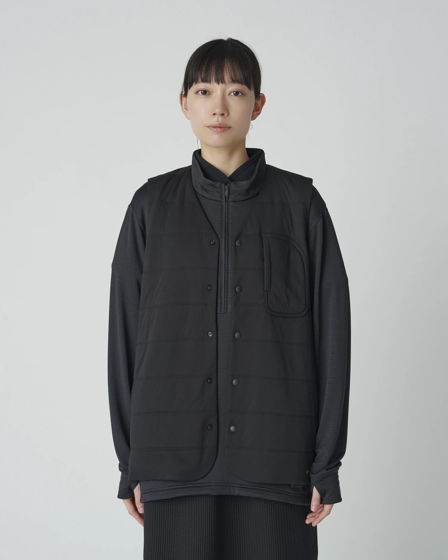 With a sleek, seam-free front placket, the vest offers a clean, modern look while maintaining its functionality. The crew neck design with snap-button closure allows easy layering, whether worn over a T-shirt or tucked beneath a jacket. A snap-button chest pocket provides secure storage for valuables, while seam-integrated side pockets offer effortless accessibility. Designed for a close fit, the vest contours to the body while allowing unrestricted movement. We recommend taking your normal size for a standard fit. For a buildable, layered look, pair it with the Recycled Cotton Hoodie underneath.