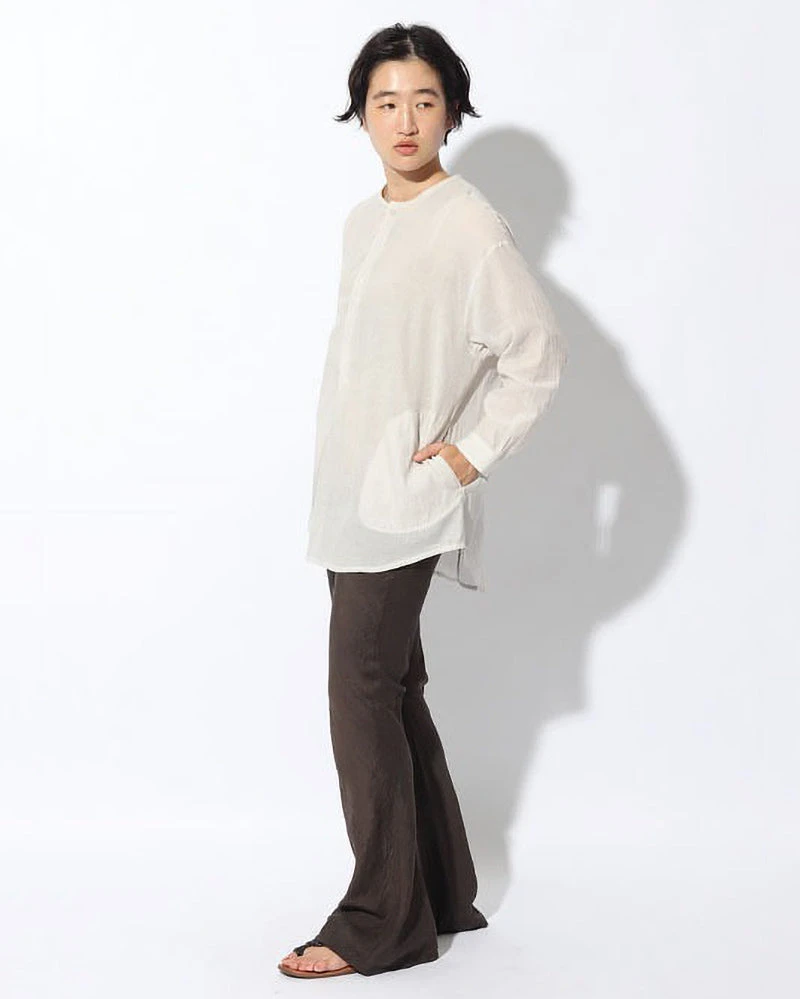 The Hand-Woven Pinstripe Sleeping Shirt is a textured tunic shirt. The shirt is made of hand-woven 100% cotton with delicate pinstripes. It features a collarless neck, henley buttons, long sleeves, and dual pockets at the hem.
