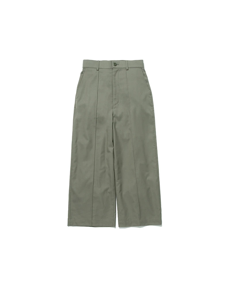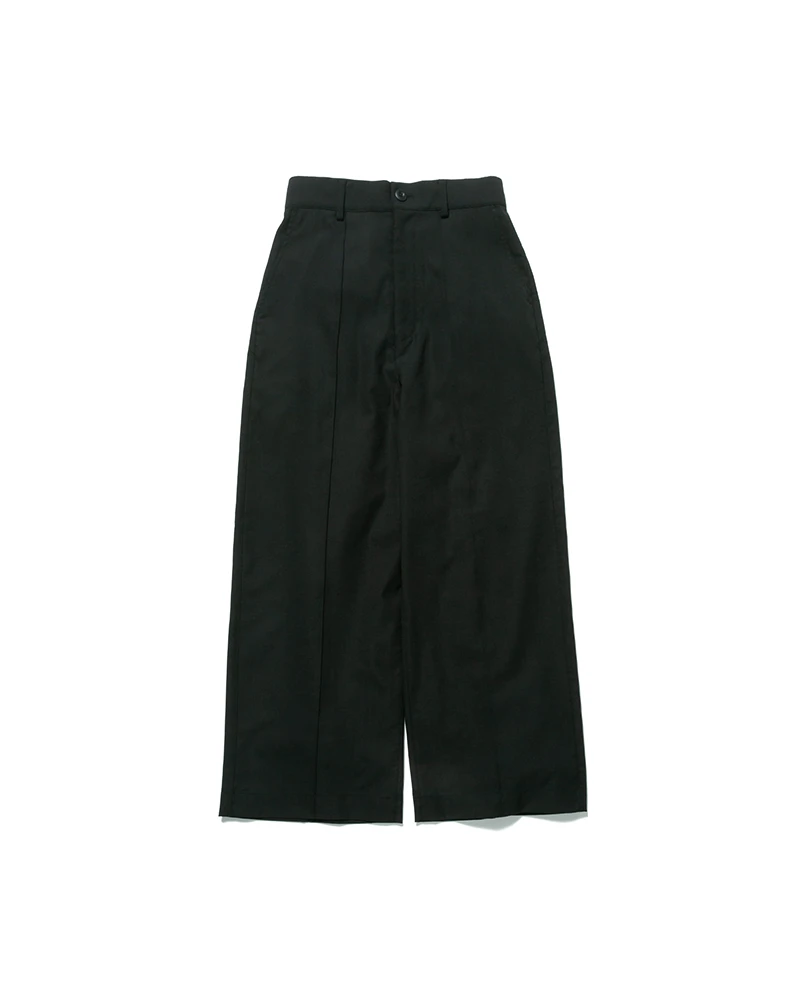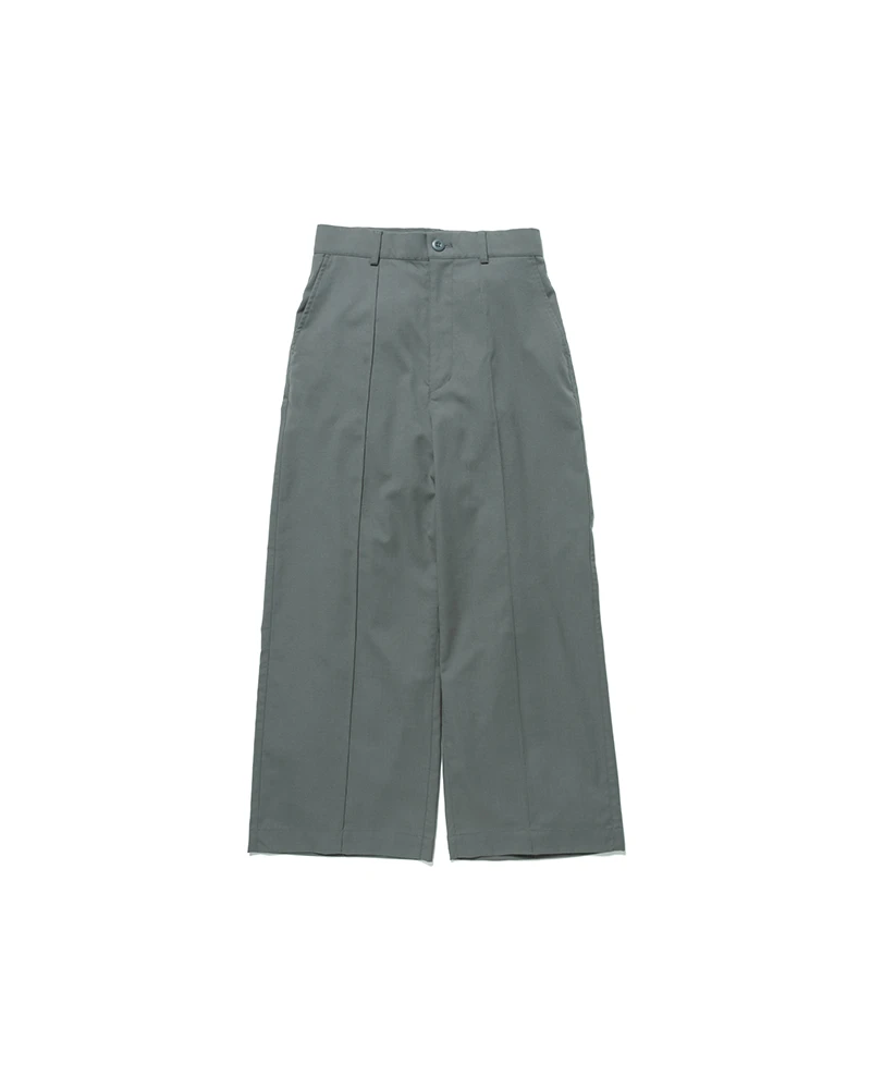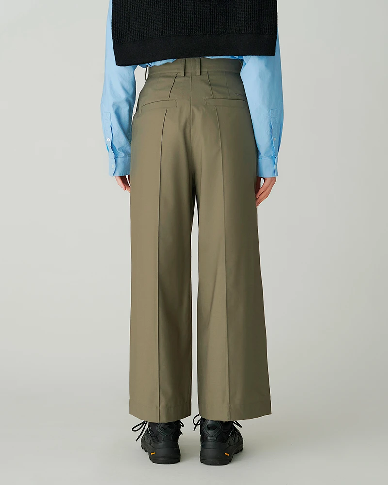 The Hybrid Wool Wide Pants are wide-leg trousers made from a polyester wool blend. This blend enhances the insulating and moisture absorption properties of wool and the lightweight, quick-drying properties of polyester. The pants feature pleats on the front and back to retain the garment shape, a high waist, and a wide fit through the leg. Additional features include a button and zipper closure, belt loops, two angled pockets at the waist, and two slit pockets on the back.