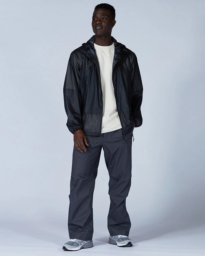 The Light Packable Rain Jacket is designed to fit close to the body. We recommend taking your normal size for a standard fit. The model stands 6′ and wears size L.