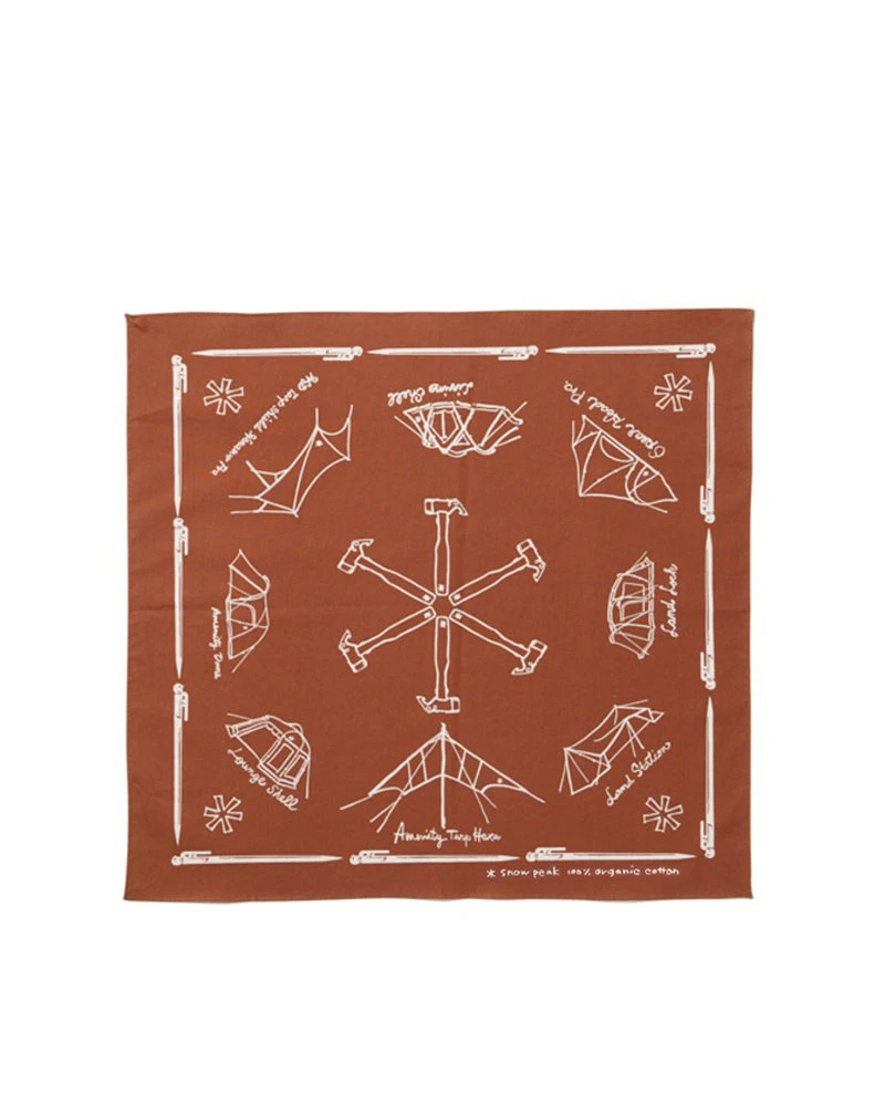 The Organic Cotton Noasobi Bandana is hand-printed and made of 100% cotton. Each bandana features illustrations of Snow Peak’s iconic tents and shelters.