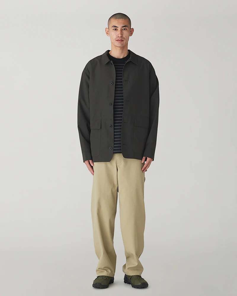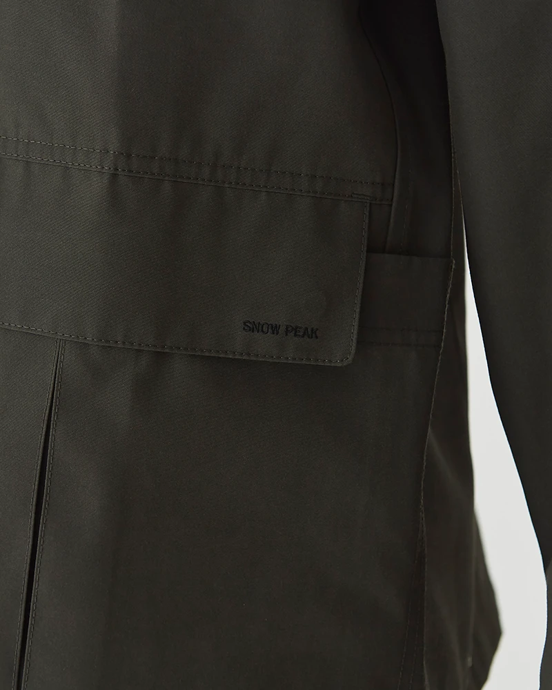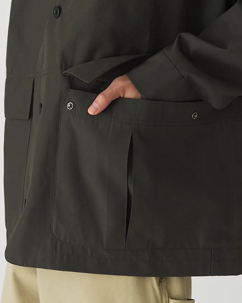 Featuring a clean, structured look with a traditional folded collar and a secure five-button front closure, this jacket is as refined as it is rugged. The blend of recycled polyester and cotton offers a matte finish that is both lightweight and exceptionally durable. It is specifically treated to resist water-based stains, keeping you looking sharp in unpredictable weather.