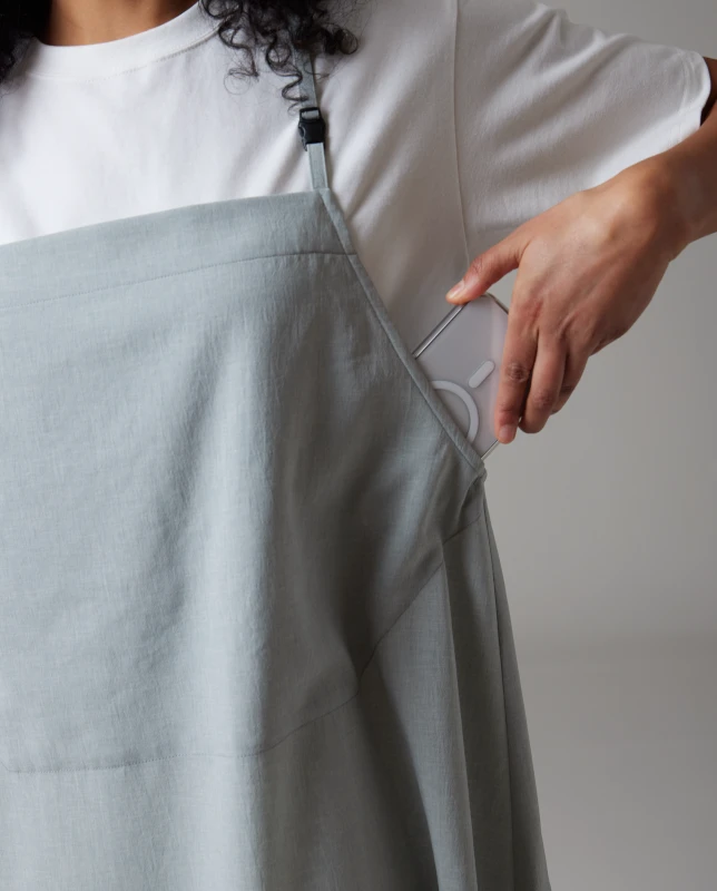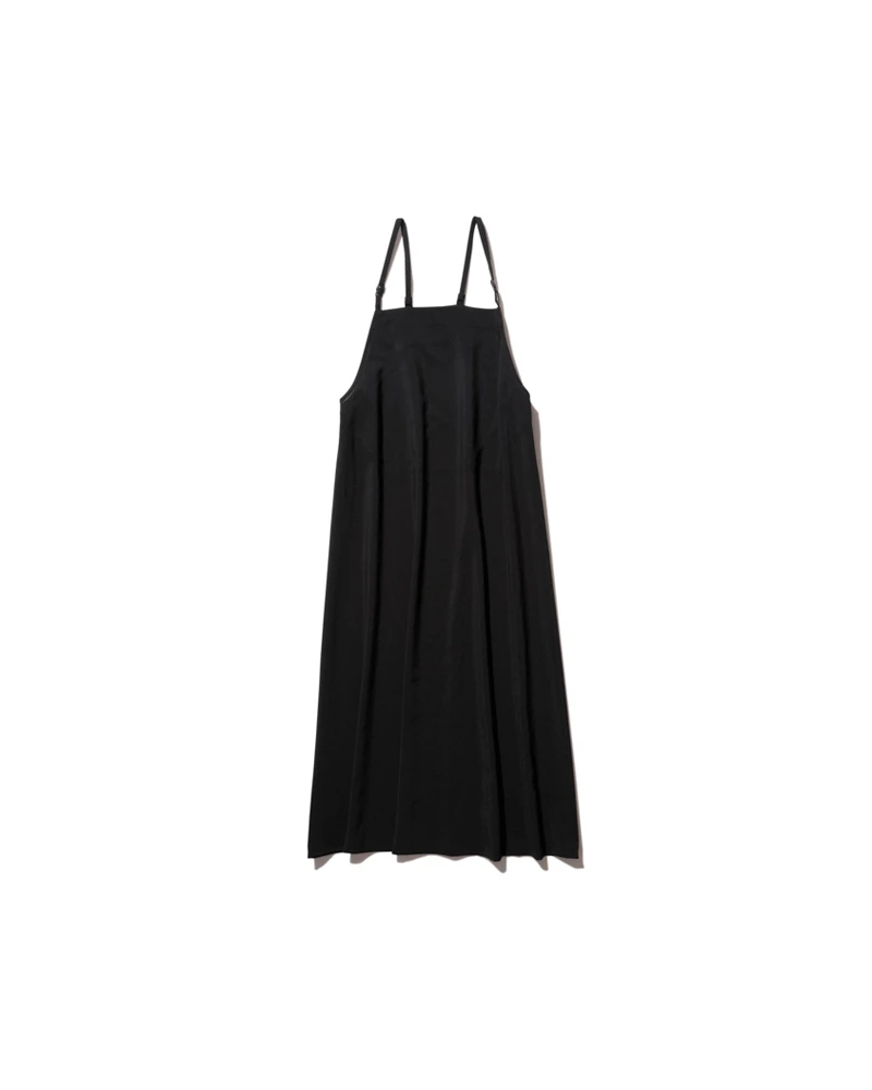 This dress features a clean A-line silhouette that flows effortlessly to a mid-shin length. The adjustable cami straps are finished with functional buckles for a custom fit, while the straight hem and hidden pocket provide a streamlined, minimalist look. The fabric’s crepe texture adds a sophisticated depth to the garment’s visual appeal.