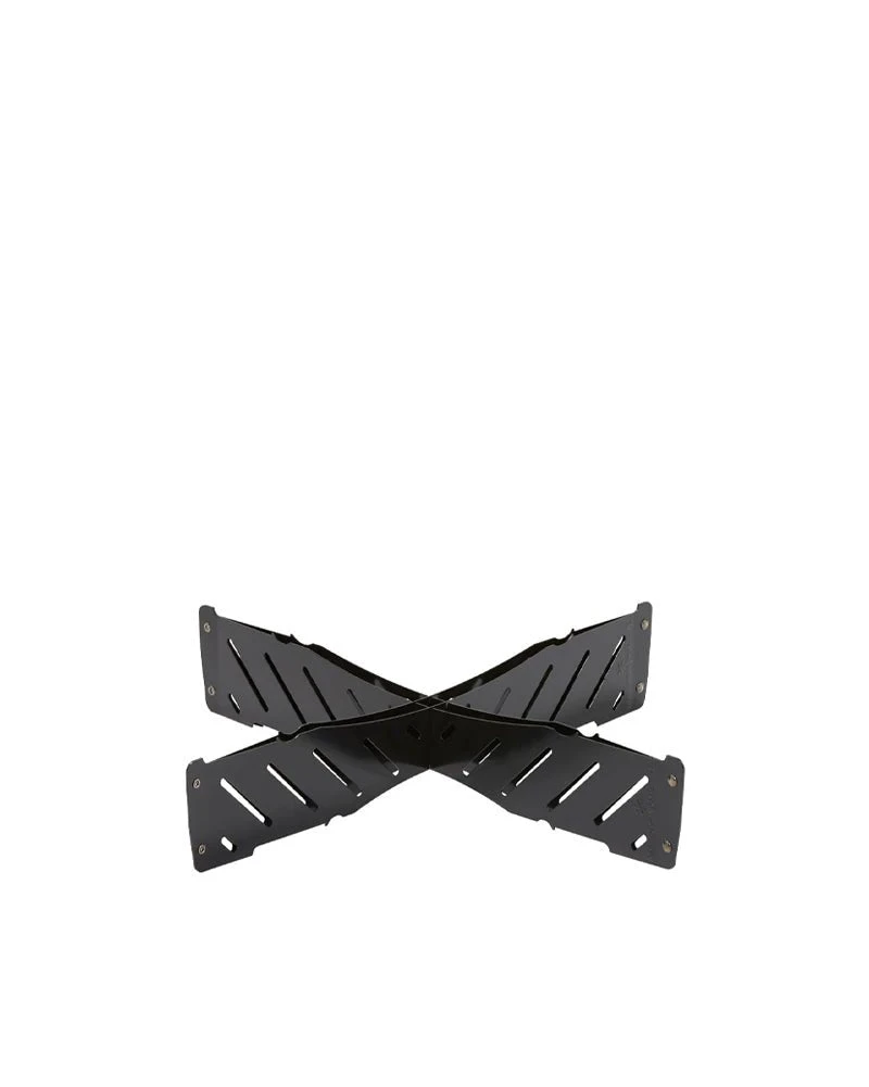 Made of steel and designed in Japan, the Base Plate Stand L/M serves as a sturdy base that prevents damage to the ground by eliminating heat transfer. To use, place the two pieces together to form an X shape, then set the Base Plate on top, followed by the Pack & Carry Fireplace. Ensure the notches on the Base Plate Stand align with the slots on the Base Plate. Pair the Base Plate Stand L/M with theÂ