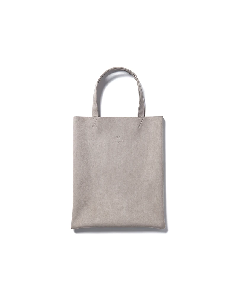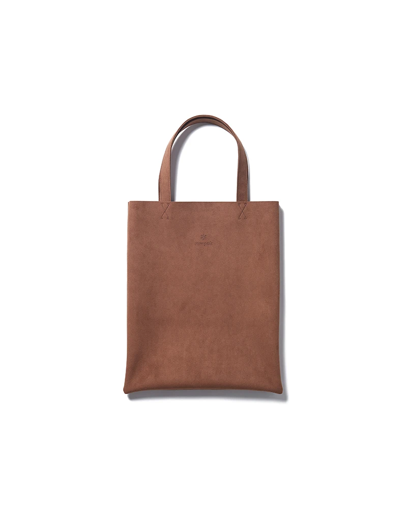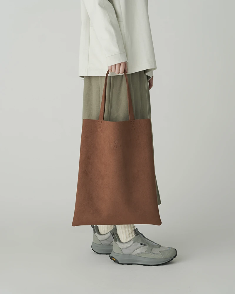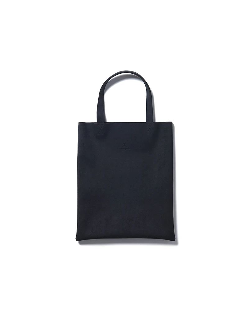 This slim-profile tote features a sophisticated dark grey/charcoal finish with a luxurious suede-like texture. The front is accented with a subtle, precision-embossed Snow Peak logo, offering a clean and professional look that transitions seamlessly from the office to the outdoors.