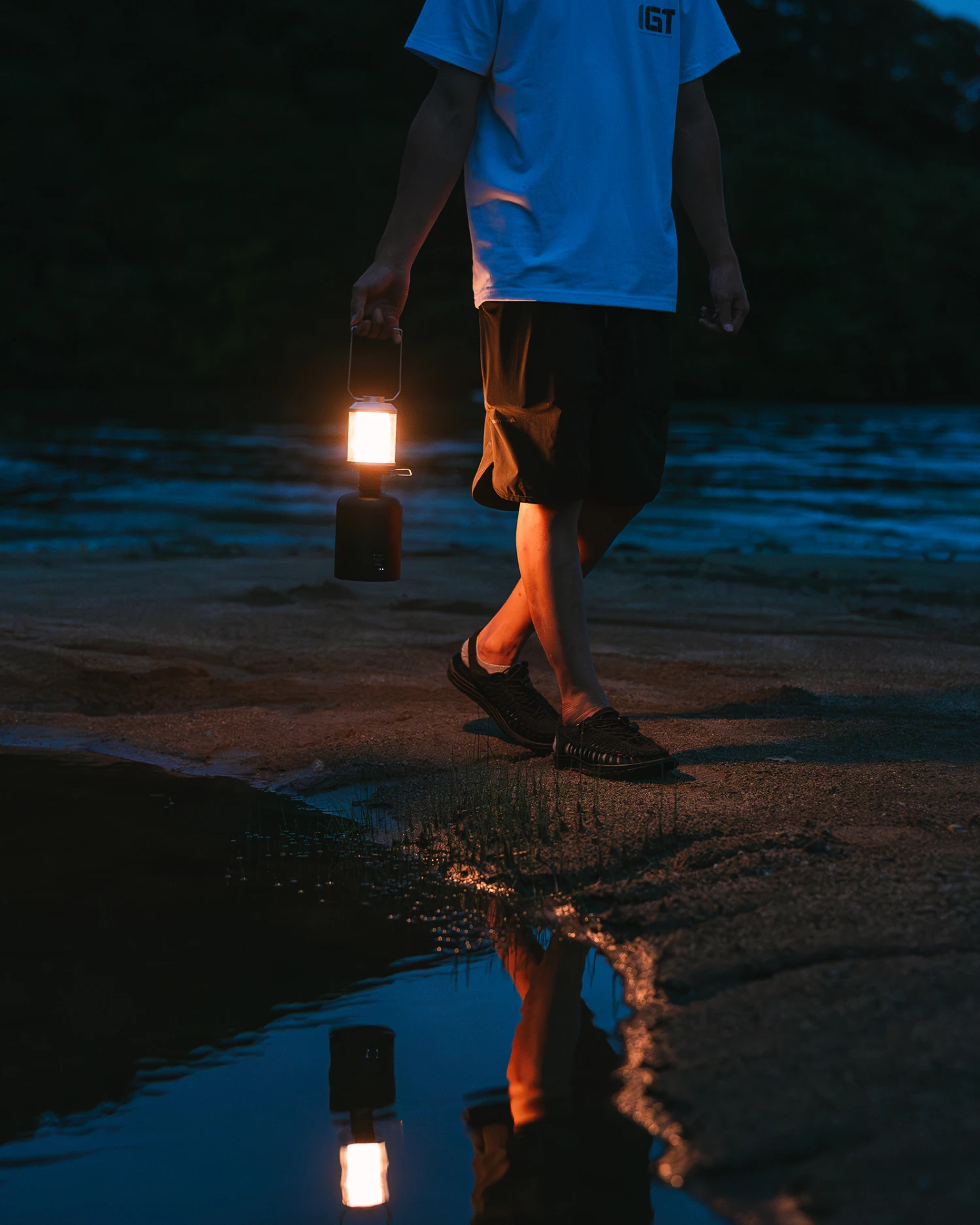 The GigaPower Hanging Lantern is an LED lantern that can be used as the primary light source for your campsite or interior space. The lantern features a glass shade and a large light tube for 360° illumination, with a folding hanger that can also be used as a handle. Designed to have the look and feel of a gas lantern, the brightness can be fine-tuned with a knob on the side, and the light tube features a mesh pattern reminiscent of a lantern mantle.