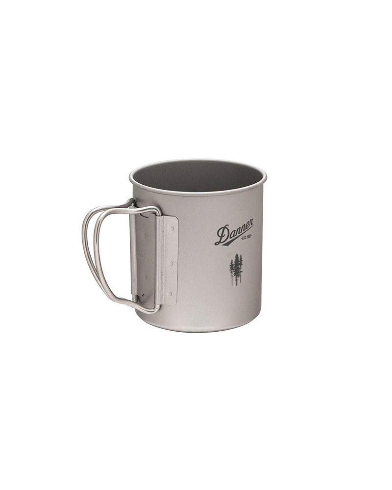 The mug features a sleek matte titanium finish, showcasing the classic Snow Peak logo on one side and the iconic Danner mountain logo on the reverse. Its single-wall construction is engineered for versatility, allowing it to be placed directly over a campfire or stove for quick warming.