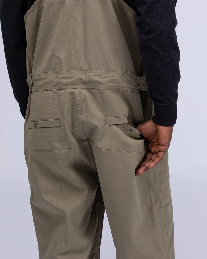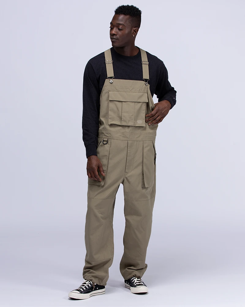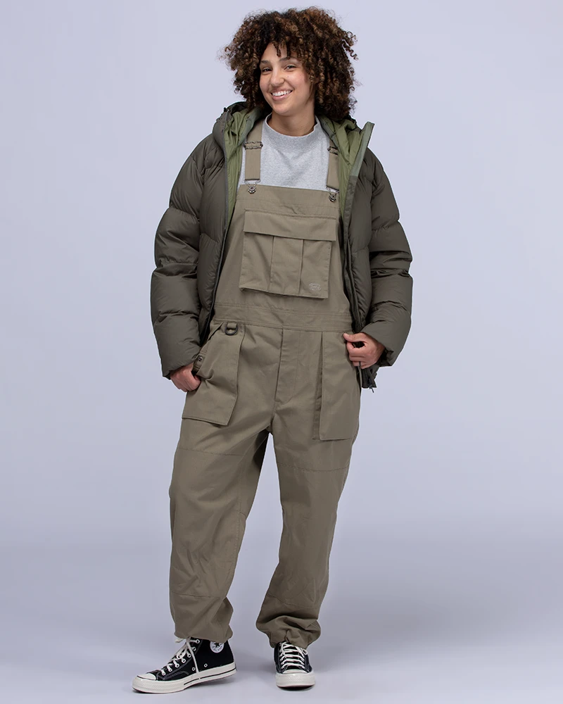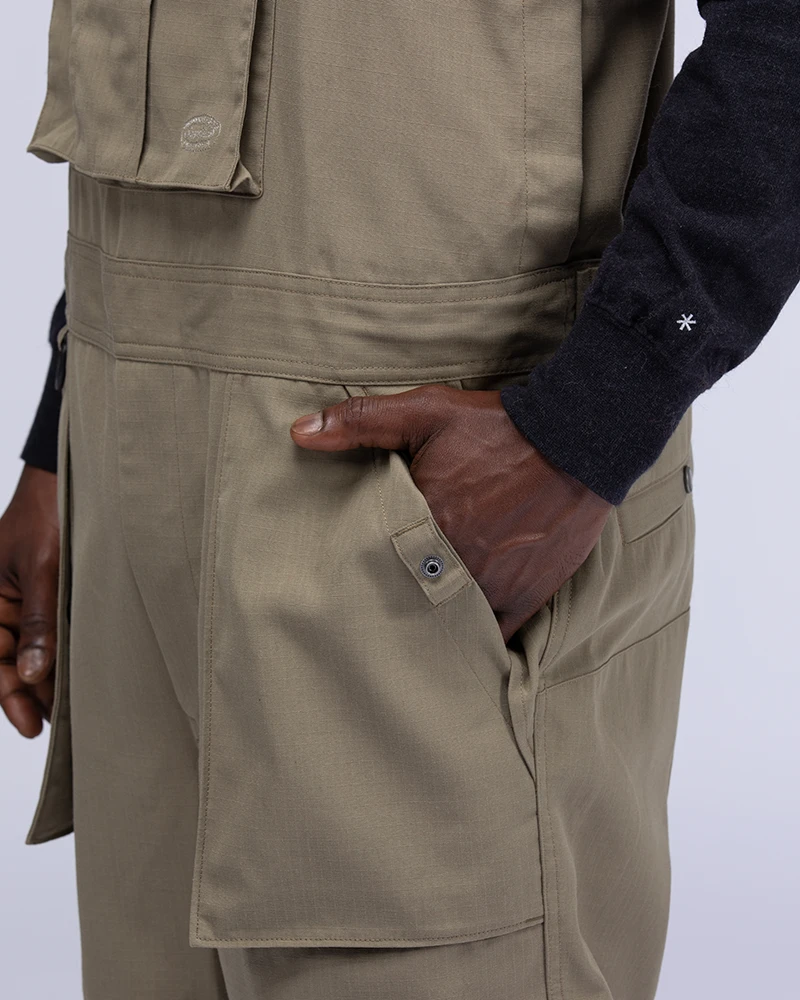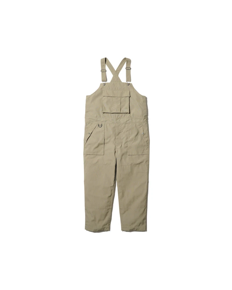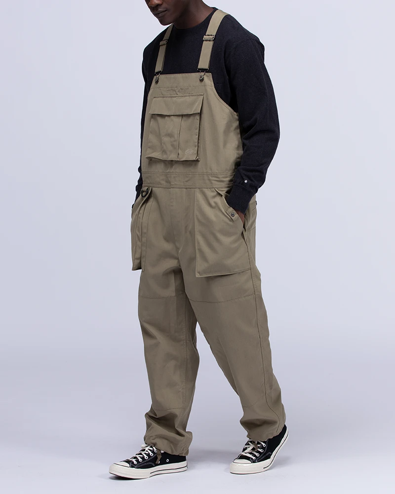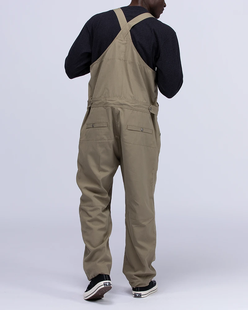 The Takibi Overalls are fire-resistant utility overalls. The fabric is made of aramid and organic cotton for water repellency and fire resistance. The overalls feature adjustable shoulder straps, a buttoned bust pocket, adjustable bottom waist, two front pockets, and two back pockets.