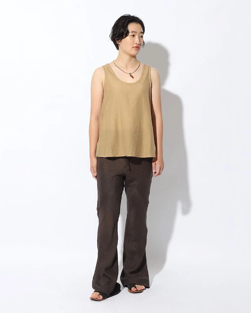 This tank top showcases the intricate weave of hand-woven warp silk and weft cotton. The scoop neck and sleeveless silhouette provide a timeless look, while the hem hits gracefully below the waist for versatile styling.